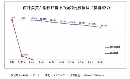 The retention rate of active ingredients in Purcurmin® turmeric of CUHK is still 81.30% after standing for 9 days in the test of light resistance and acid and alkali resistance;